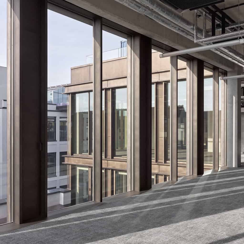Doering Glass aus Radeburg verarbeitete 1.330 Dreifachverglasungen mit Abmessungen bis zu 2.980 mal 3.490 Millimeter. Die Gesamtfläche beträgt 3.592 Quadratmeter. Das Unternehmen lieferte die Elemente direkt in die dicht bebaute Innenstadt Berlins. Das verwendete Sonnenschutzglas Climatop Cool-Lite Xtreme 70/33 von Saint-Gobain Glass erreicht eine Lichttransmission von 70 Prozent bei einem Gesamtenergiedurchlassgrad von 0,33. Die Werte bedeuten: Die Räume erhalten viel Tageslicht, heizen sich aber kaum auf. Einige Scheiben bekamen zusätzliche SI-Folien, um den Anforderungen an den Schallschutz im innerstädtischen Umfeld zu entsprechen.