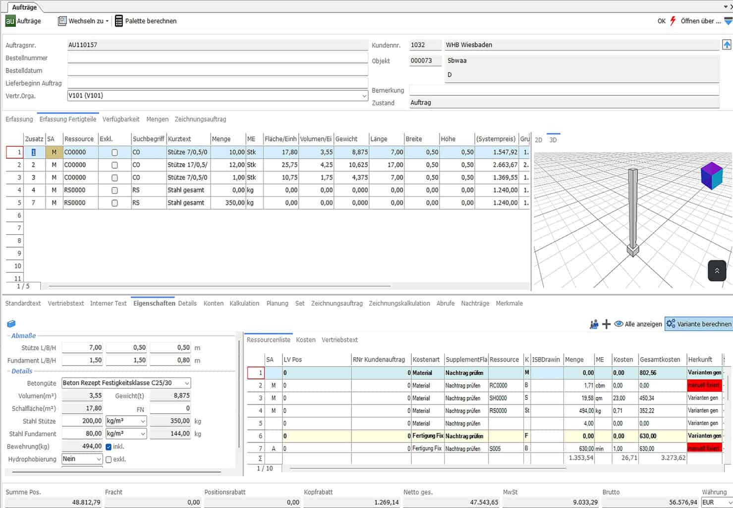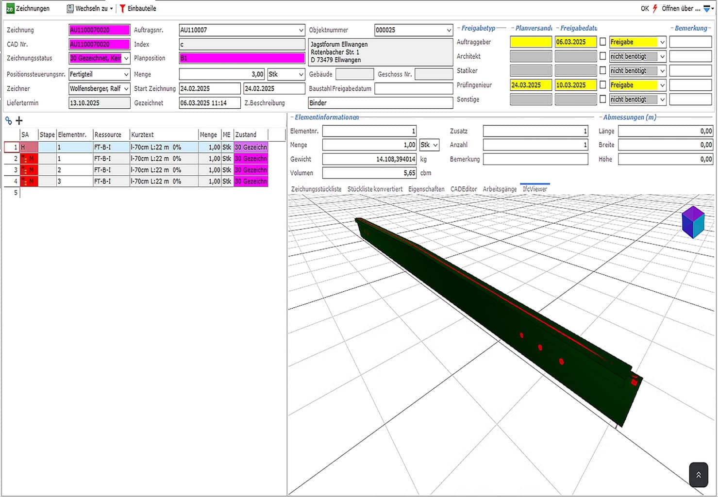 Ein integrierter Viewer stellt die IFC-Dateien dar. Alle Nutzer mit einer ERP-Lizenz können die Dateien einsehen. Die Anzeige erfasst Struktur und Eigenschaften des Modells. Anwender erkennen, ob die eingeplanten Produkte zum Projekt passen. Der Reiter „Elemente planen“ zeigt Hintergrunddaten zu jedem einzelnen Element an. Das Projektcenter führt alle einzelnen Zeichnungen zu einem Objekt zusammen. Das Programm berechnet dann die benötigten Ressourcen innerhalb von Aufträgen automatisch. Ein visuelles Statushandling unterstützt die Übersicht – beispielsweise färbt das System alle bereits ausgelieferten Teile grün ein.