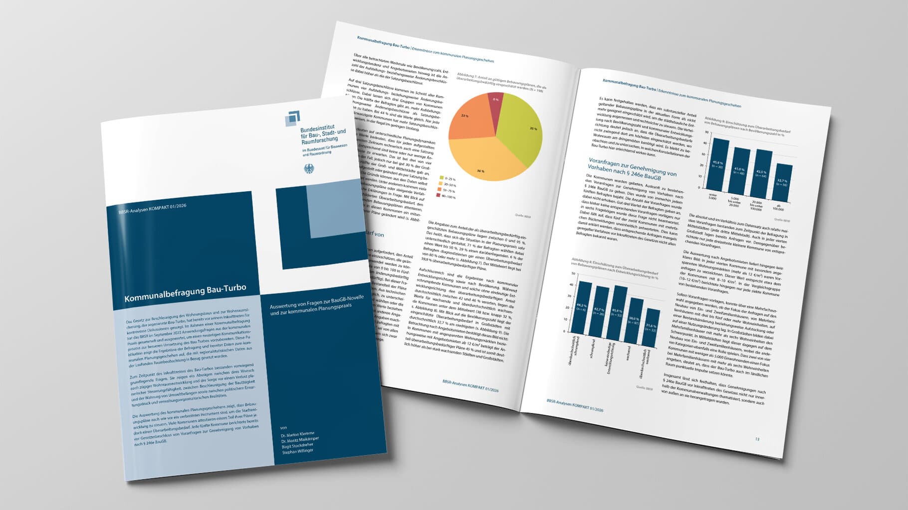 Die Auswertung des kommunalen Planungsgeschehens zeigt, dass Bebauungspläne nach wie vor ein verbreitetes Instrument sind, um die Stadtentwicklung zu steuern. Viele Kommunen attestieren einem Teil ihrer Pläne jedoch einen Überarbeitungsbedarf. Jede fünfte Kommune berichtete bereits vor Gesetzesbeschluss von Voranfragen zur Genehmigung von Vorhaben nach § 246e BauGB.