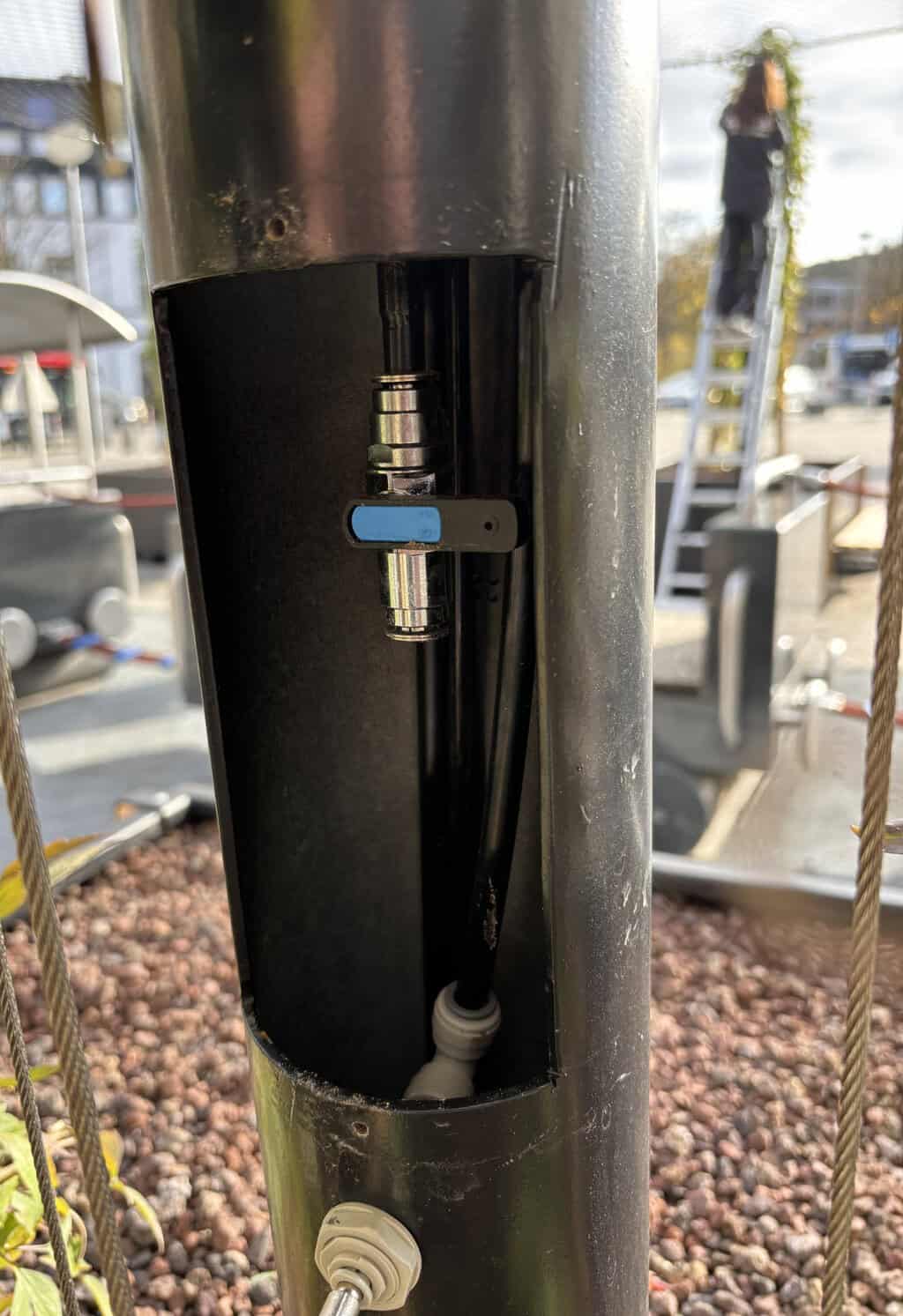Eine smarte Pumpentechnik verteilt das Wasser zu den einzelnen Pflanzkübeln. Der Betreiber steuert das System über ein digitales Dashboard. „Die Wassermenge sowie die Abstände, in denen das Wasser vernebelt wird, variieren je nach Temperatur und Umgebungsfeuchtigkeit“, erklärt Tim Volkmer, Technischer Leiter bei optimal Planen GmbH. „Die Sensoren regeln, dass nur so viel Wasser im System zirkuliert, wie auch tatsächlich gebraucht wird.“ Die Pumpe sitzt an einem der Pflanzkübel, eine Verkleidung bildet eine optische Einheit mit dem Kübel und bietet Platz etwa für eine Infotafel. Eine Ringleitung am Rand des Edelstahlseilnetzes versorgt die übrigen Kübel.