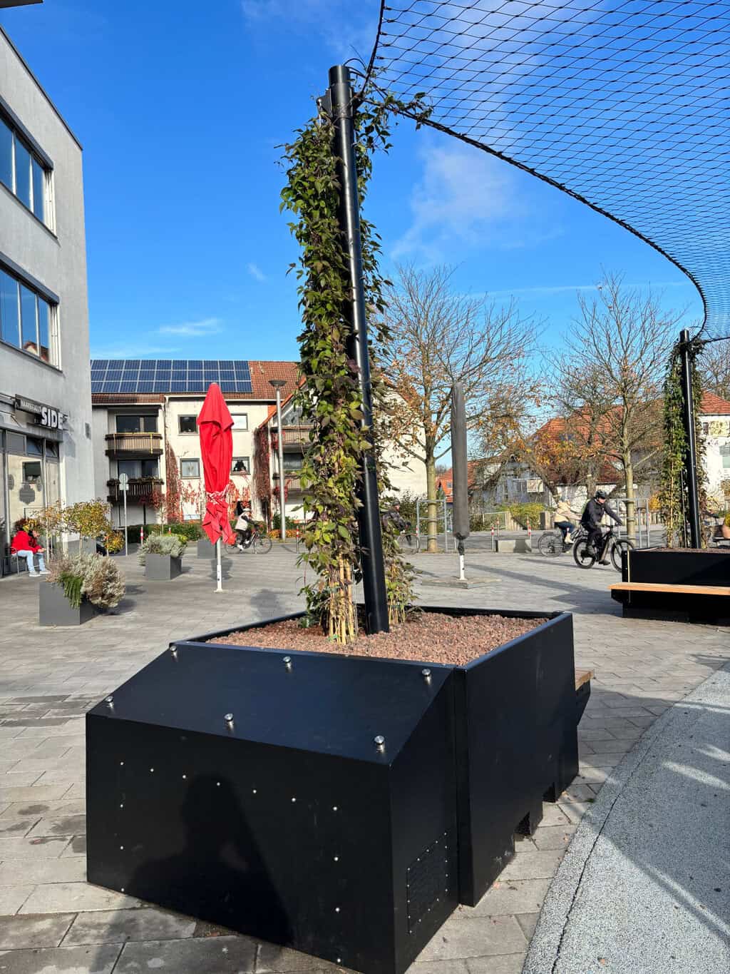 Jedes LivingShade-System entsteht standortbezogen als Einzelkonstruktion, setzt sich aber stets aus denselben sechs Komponenten zusammen. Das Fundament bilden Pflanzkübel aus Edelstahl mit einer Grundfläche von 1,50 mal 1,50 Metern und einer Höhe von 80 Zentimetern. Sie nehmen Beschwerungsplatten, Granulat und ein großes Erdvolumen auf und sichern so die Standfestigkeit – ganz ohne Bodenverankerung. Gleichzeitig dienen sie als Pflanzraum für die Kletterpflanzen, die später das schattenspendende Dach bilden. Sitzgelegenheiten lassen sich an den Kübeln anbringen und erhöhen die Aufenthaltsqualität unter der beschatteten Fläche.