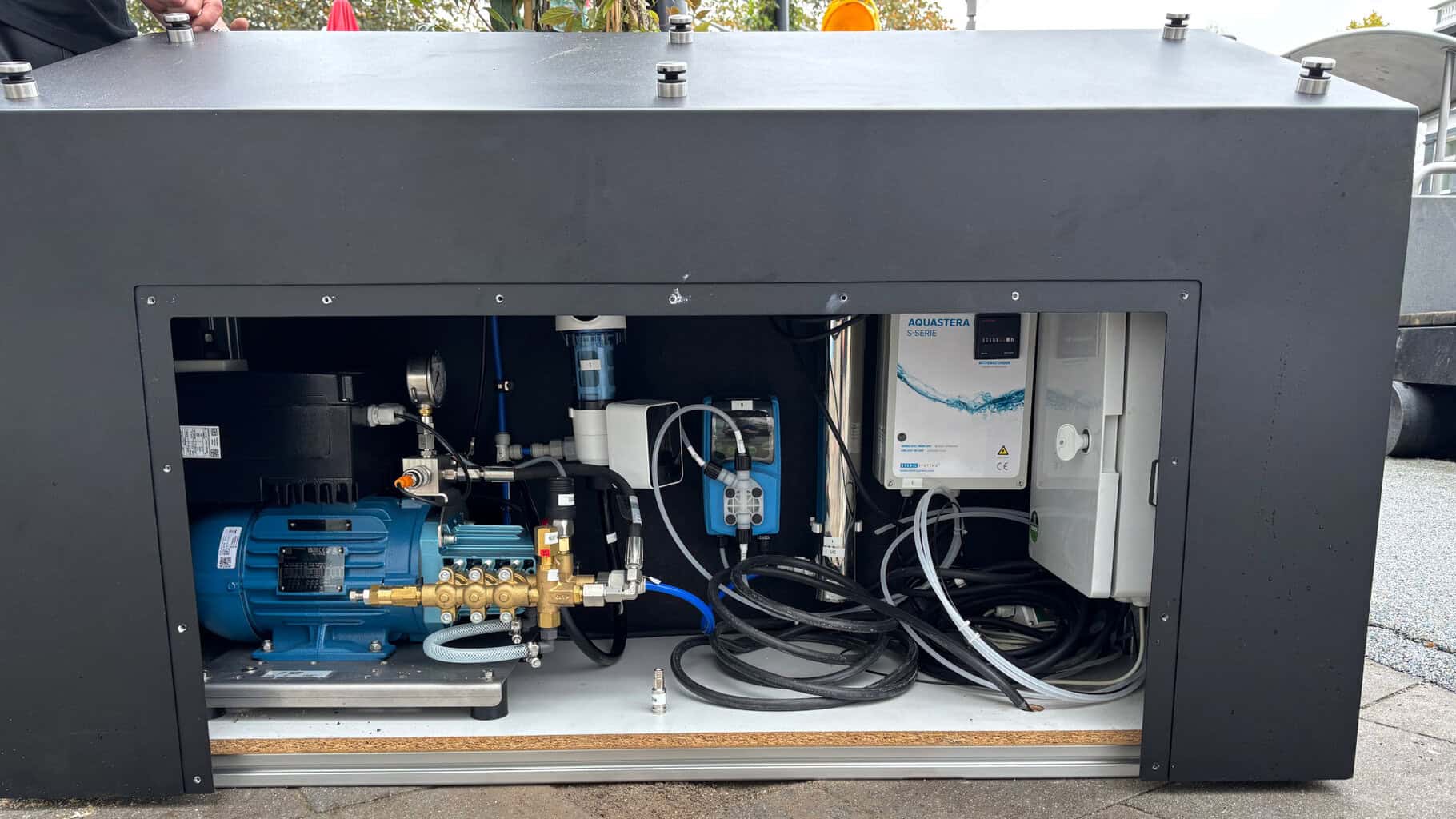 Das Wasser gelangt über eine Zuleitung aus dem Boden in das Pumpensystem. Dort durchläuft es vier Aufbereitungsstufen: Entkalkung, Filtration, Desinfektion mittels energiereichem UVC-Licht sowie eine niedrig dosierte chemische Desinfektion. Diese vierfache Aufbereitung gewährleistet eine hohe Wasserqualität im gesamten System. Ein Rückschlagventil verhindert das Eindringen von ungereinigtem Wasser.