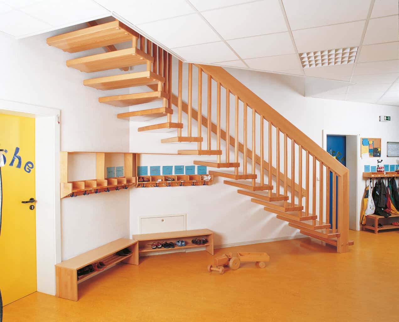 Die erste geprüfte Konstruktion ist eine klassische Holzwangentreppe, die sich speziell für Gebäude in Holzbauweise eignet. Das zweite Modell ist eine freitragende Systemtreppe, bei der die Stufen nur einseitig an der Wand verankert sind und die ihre Stabilität über das Geländer bezieht. Damit stehen zwei konstruktiv unterschiedliche Lösungen zur Verfügung, die eine durchgängige Bauweise in Holz auch dort ermöglichen, wo Brandschutzvorschriften bislang den Einsatz des Materials verhinderten. (mb)