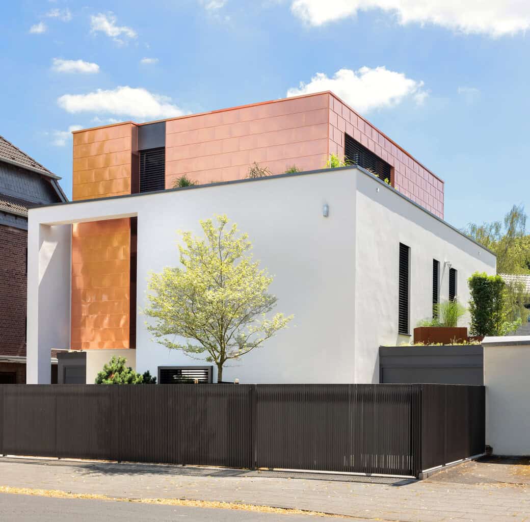 Die Putzfassade zeigt sich hochglatt und flächig in einem hellen Creme-Ton. Sie bildet den Rahmen für die Kupferfassade, deren Schindeln (KME Tecu Classic coated) die Fachhandwerker präzise bis in die Laibungen verarbeiteten. Die Spannung zwischen den ruhigen Putzflächen und den glänzenden Kupferelementen erzeugt wechselnde Ansichten aus verschiedenen Blickwinkeln.
