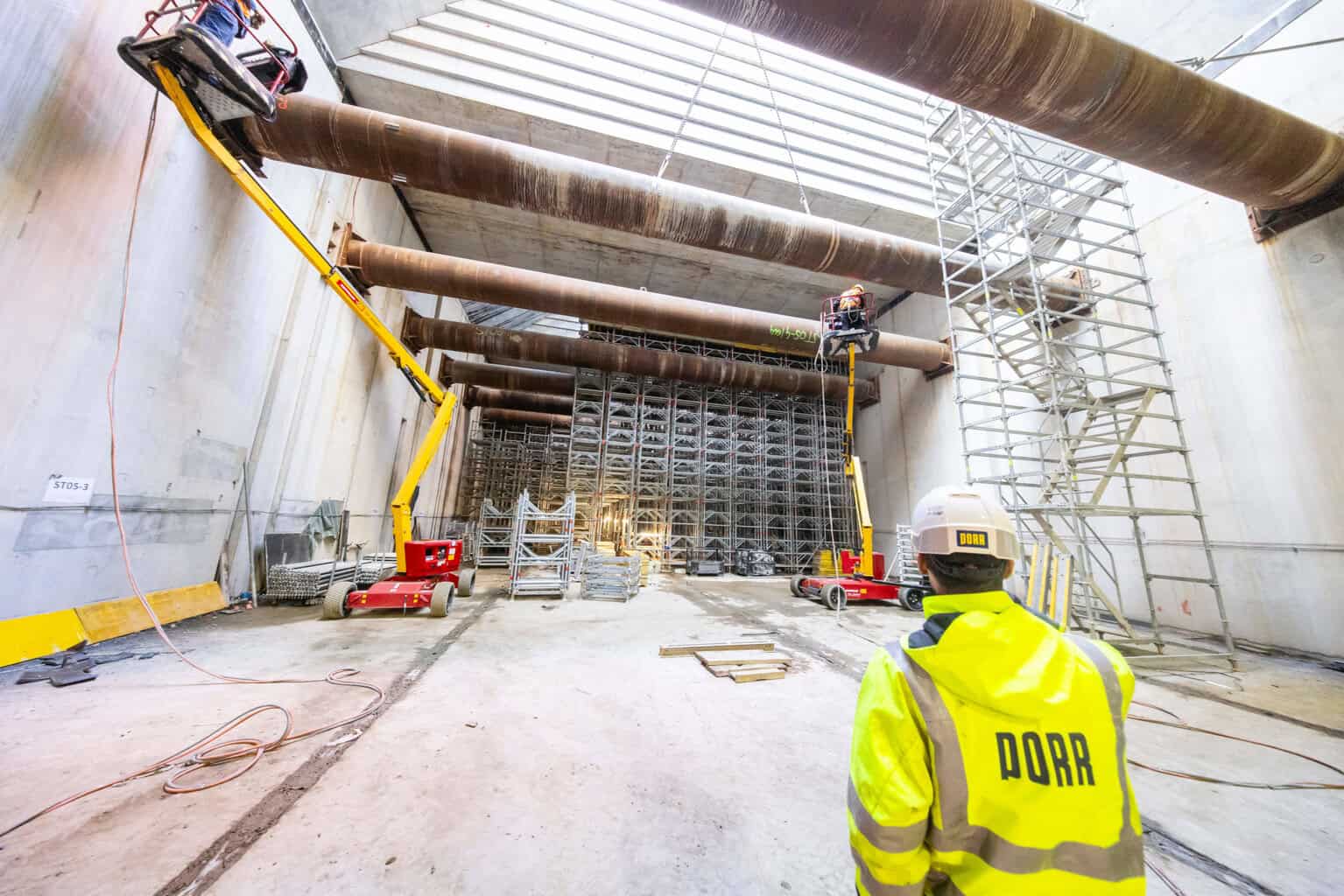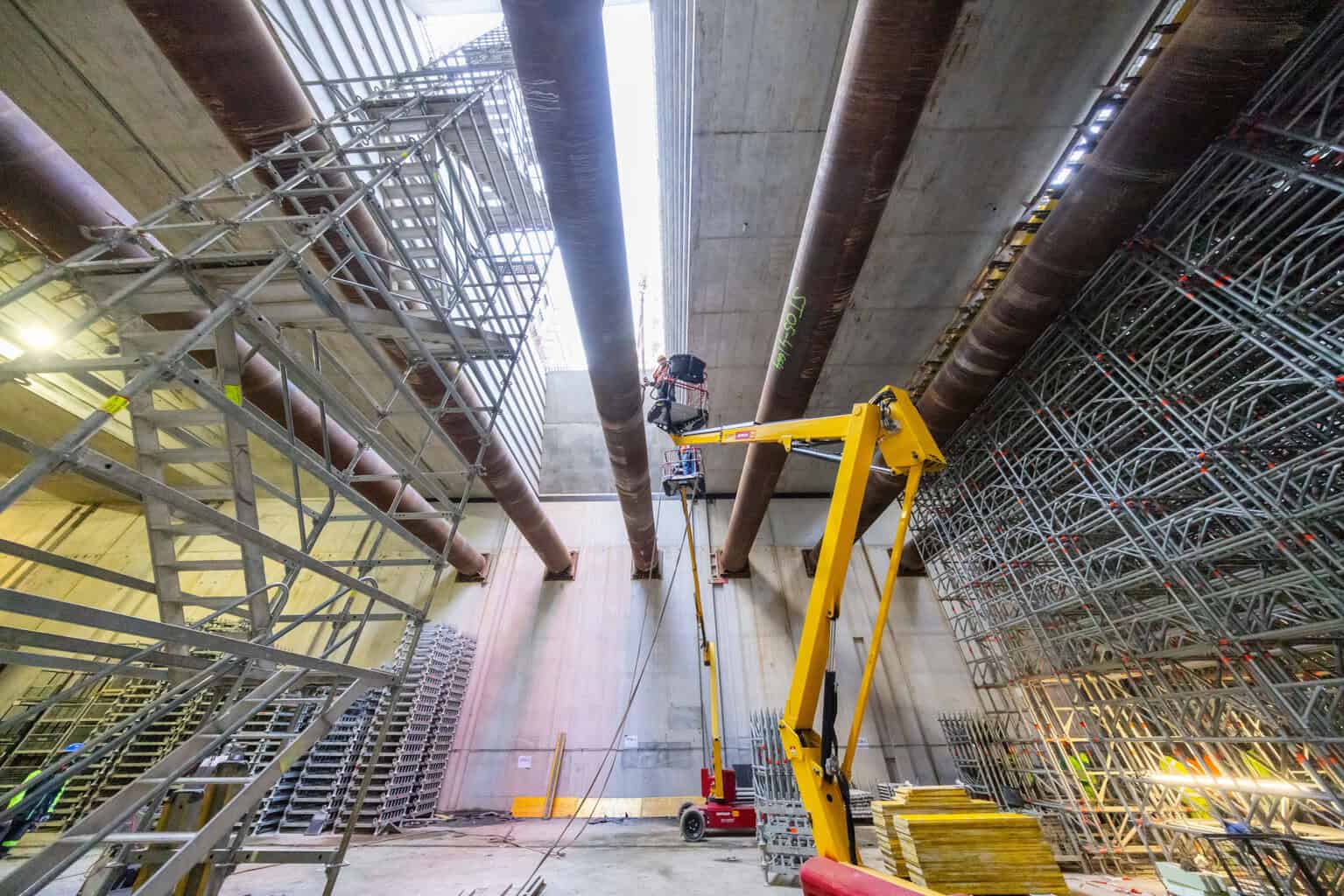 Mit dem Fortschritt des Rohbaus beginnt der schrittweise Rückbau der temporären Aussteifungskonstruktionen. Die Stahlbeton- und Stahlsteifen, die die Baugrube während der Arbeiten gegen Erd- und Wasserdruck gesichert haben, weichen nun nach und nach. Bereits zwölf von 26 Stahlbetonsteifen der ersten Lage sowie 21 von 50 Stahlsteifen entfernte das Bauteam; vier weitere folgen zeitnah. Jede demontierte Steife belegt, dass das Bauwerk die Lasten aus Erd- und Wasserdruck nun dauerhaft selbst aufnimmt.