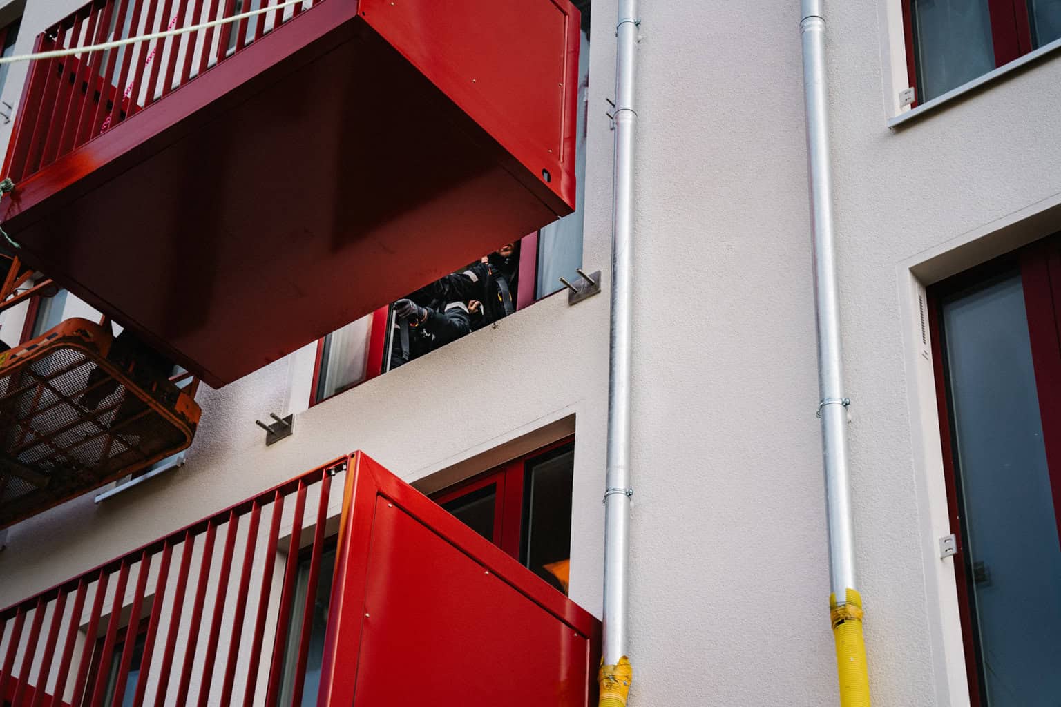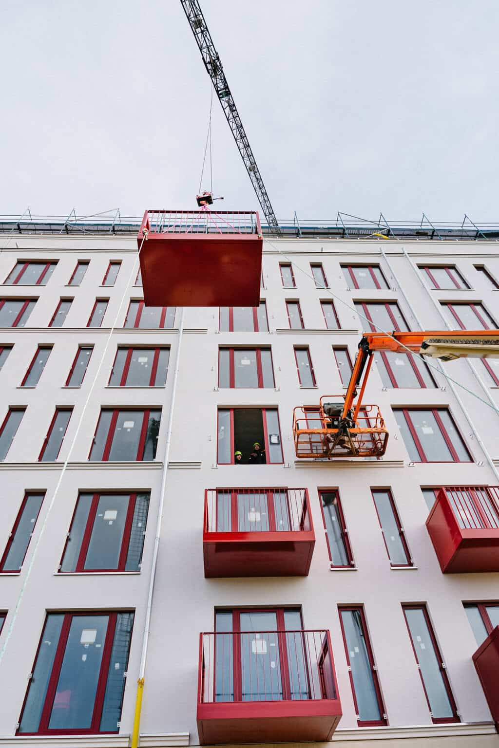 Auch die 759 frei auskragenden Balkone folgen der Logik des seriellen Bauens. Die Stahlkonstruktionen schrauben die Monteure direkt an die Stahlrahmen der Module. „Beim modularen System vereinfachen Schraub- und Stecklösungen die Prozesse. Darauf bauen wir auf“, erklärt Erdmann, der sich bei der Suche nach einer geeigneten Anschlusslösung an Schöck wandte und den Isokorb T S wählte.