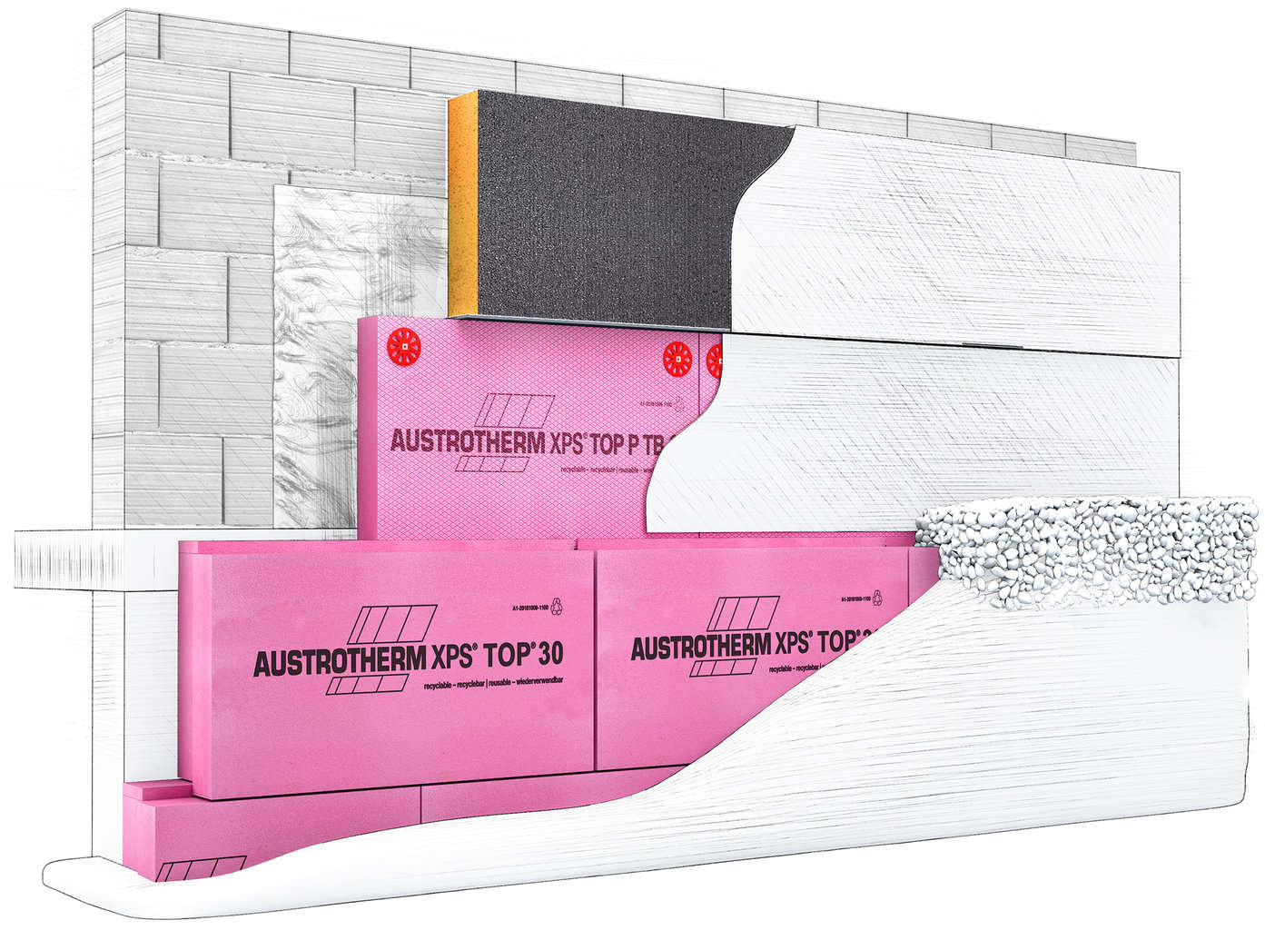 Beispielhaft sei hier auf Produkte wie Austrotherm XPS Premium P, Plus P oder TOP P verwiesen. Sie weisen je nach Typ Wärmeleitfähigkeiten von 0,027 W/mK bis 0,039 W/mK auf und tragen damit dazu bei, den U-Wert der gesamten Gebäudehülle auf durchgehend niedrigem Niveau zu halten.