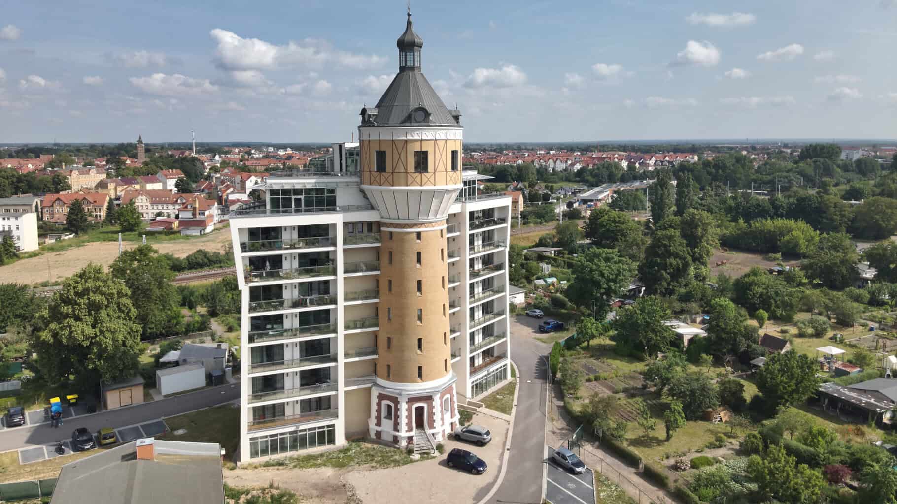 Zu den Herausforderungen des Projekts gehörten für das Eilenburger Unternehmen neben der schieren Größe die Massiv-Außenwände des Neubaus, die mit ihrer runden und konkav geschwungenen Form die Turmsilhouette aufnehmen. Auch die Verbindung zwischen Alt und Neu war anspruchsvoll: Der Anschluss des Turms, der sich zur Hälfte aus dem Wohngebäude herauszuschälen scheint, schloss das Unternehmen mit präzise vorgefertigten Beton-Fertigteilen an. So wurde es möglich, den Turmschaft in jeder Etage als zusätzlichen Raum in die dazugehörige Wohnung einzubeziehen.