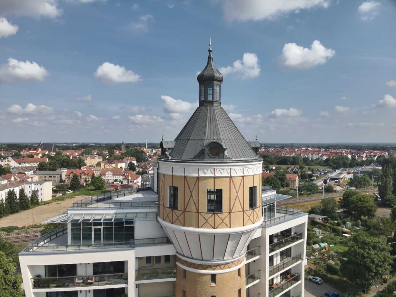 Lösbar umso mehr, als beim Wasserturm Delitzsch alle Rahmenbedingungen stimmten: „Der Datenaustausch mit Michael Tauchnitz lief hervorragend. Dank seiner CAD-Dateien war es unkompliziert, die runden Gauben an die Schrägen des Dachstuhls anzupassen, der als Neukonstruktion ohnehin unkomplizierter war als ein in die Jahre gekommenes Bestandsdach.”