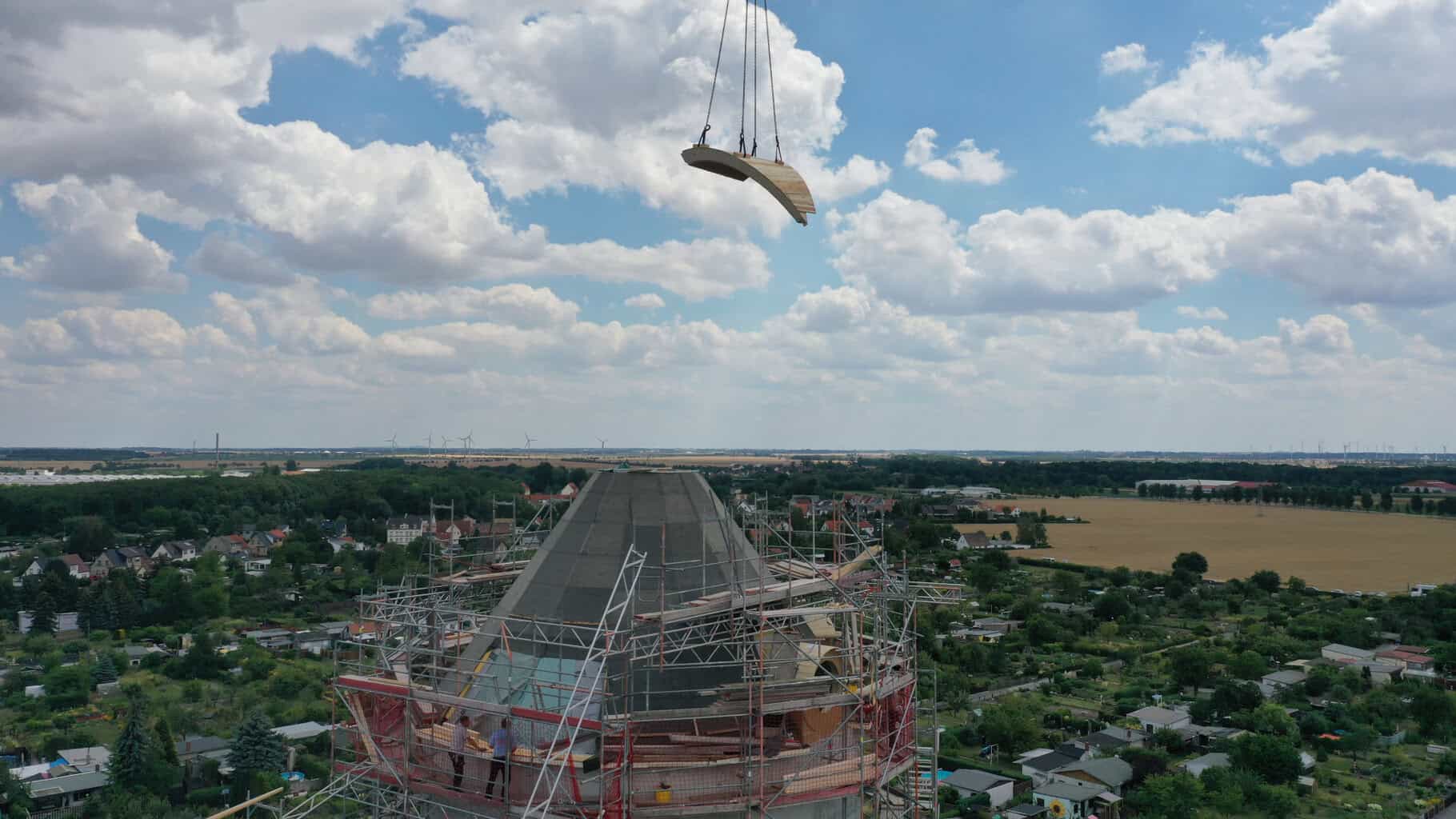 Auch beim originalgetreuen Wiederaufbau des Dachs setzte man in Eilenburg auf Vorfertigung. Michael Tauchnitz, bei Landbau Eilenburg für den Dachstuhl zuständiger Zimmermeister, plante die nahezu runde Dachkonstruktion per CAD-System. Anschließend wurden die dreieckigen Dachelemente in der Werkhalle produziert und auf die Baustelle geliefert: „Eine gewisse Herausforderung war es dabei, die 15 Gratsparren oben so zusammenzuführen, dass ein harmonischer Abschluss entsteht. Den Anker bildet dort ein Stahlring, auf dem die Turmlaterne steht.“