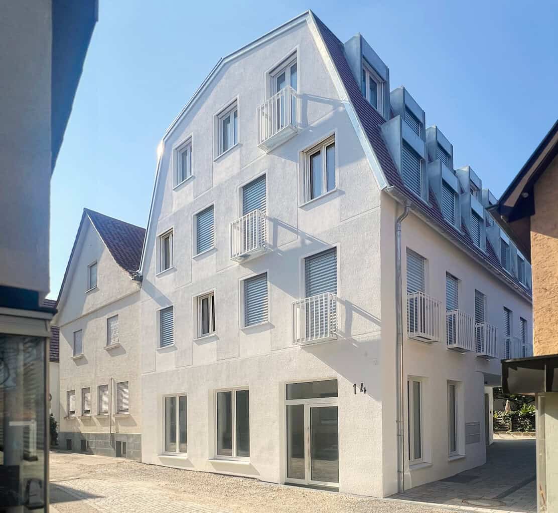 Das alte Gebäude aus dem Jahr 1785 musste nach einem Hagelschaden weichen. An seiner Stelle sollte ein zeitgemäßes Wohn- und Geschäftshaus entstehen – mitten in der Altstadt, wo jeder Quadratmeter zählt. „Wir hatten hier mitten in der Altstadt nur wenige Quadratmeter für die Baustelleneinrichtung und konnten keinen Kran aufstellen“, erzählt Architekt Prof. Michael Meyer. „Daher fiel schon früh die Entscheidung, die gesamte Gebäudehülle ab dem ersten Obergeschoss mit Liapor-Fertigelementen zu errichten, die sich problemlos per Autokran über drei Häuser hinweg einschwenken ließen.“