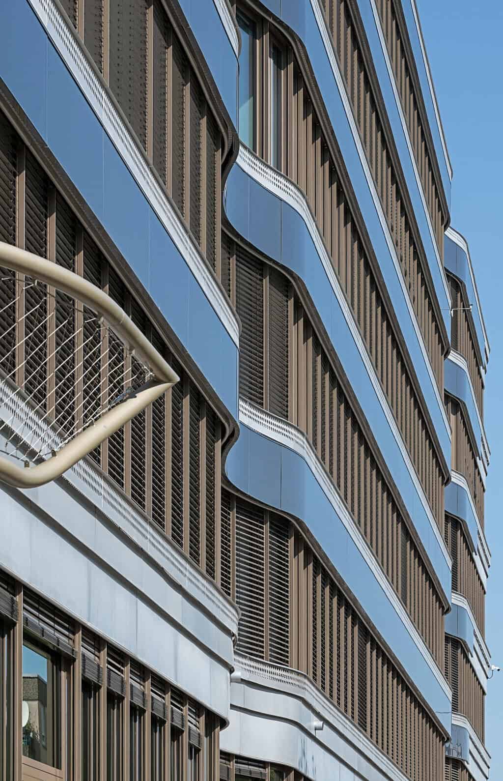 Schüco entwickelte in Zusammenarbeit mit Forster Fassadentechnik ein projektspezifisches, dezentes Halteprofil. Der Form der Brüstungsverkleidungen folgend, kamen neben üblichen flachen PV-Modulen auch eigens angefertigte konvexe und konkave PV-Module von Schüco zum Einsatz.