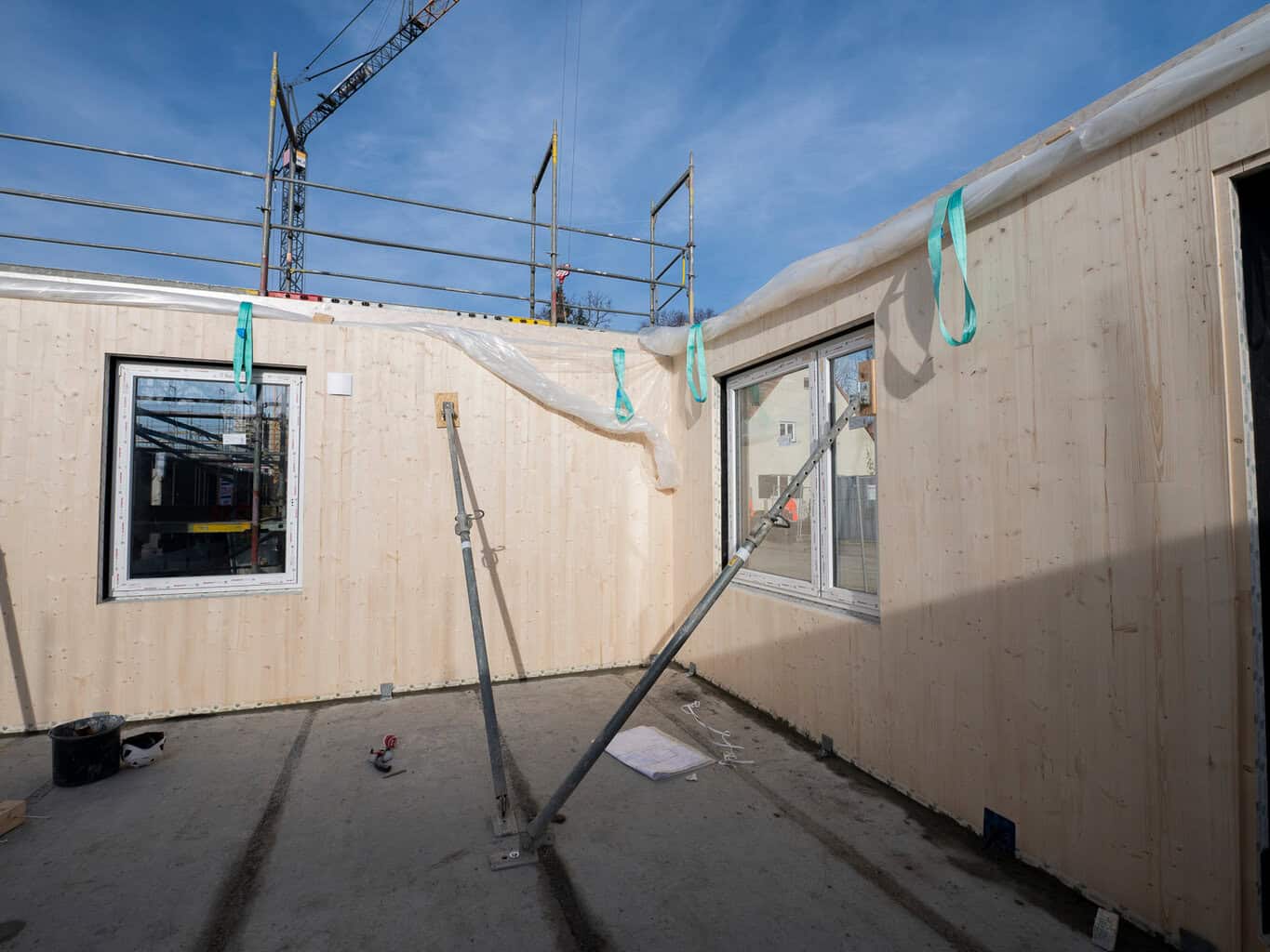 Züblin Timber fertigt die Fassadenelemente einschließlich Fenstermontage im Werk Aichach seriell. Das Unternehmen setzt das Holz-Hybrid-Bausystem Moleno ein und liefert rund 2.500 Quadratmeter Leno-ADD-Außenwände. Die Fassade erhält eine vorgegraute Wechselfalzschalung aus Fichtenholz in drei Deckenbreiten. Die flexible Bauweise ermöglicht eine präzise Umsetzung unter Werkbedingungen. Die Fertigstellung des Holzbaus ist für Februar 2026 geplant, die Gesamtfertigstellung für Ende 2026. (mb)