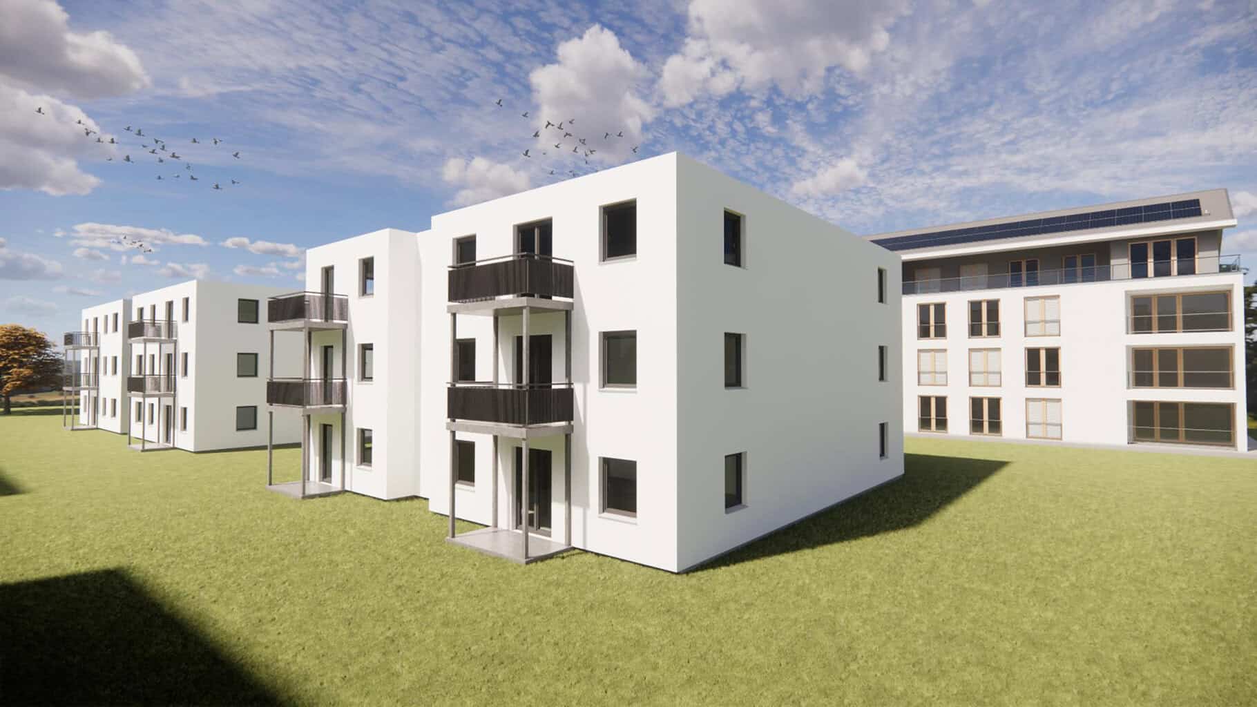 Die Außenwände erhalten werkseitig ein 20 Zentimeter starkes Wärmedämmverbundsystem (WDVS). Eine zentrale Wärmepumpe in Kombination mit Betonkernaktivierung und einer Photovoltaikanlage auf dem Flachdach übernimmt die Wärmeversorgung. Eine dezentrale Lüftungsanlage pro Wohneinheit sichert den Luftaustausch. Die Warmwasserbereitung erfolgt wohnungsweise per Durchlauferhitzer oder Speicher – ein Verzicht auf zentrale Großanlagen, der die strengen Prüfpflichten der Trinkwasserverordnung hinsichtlich Legionellen für den Betreiber entfallen lässt.