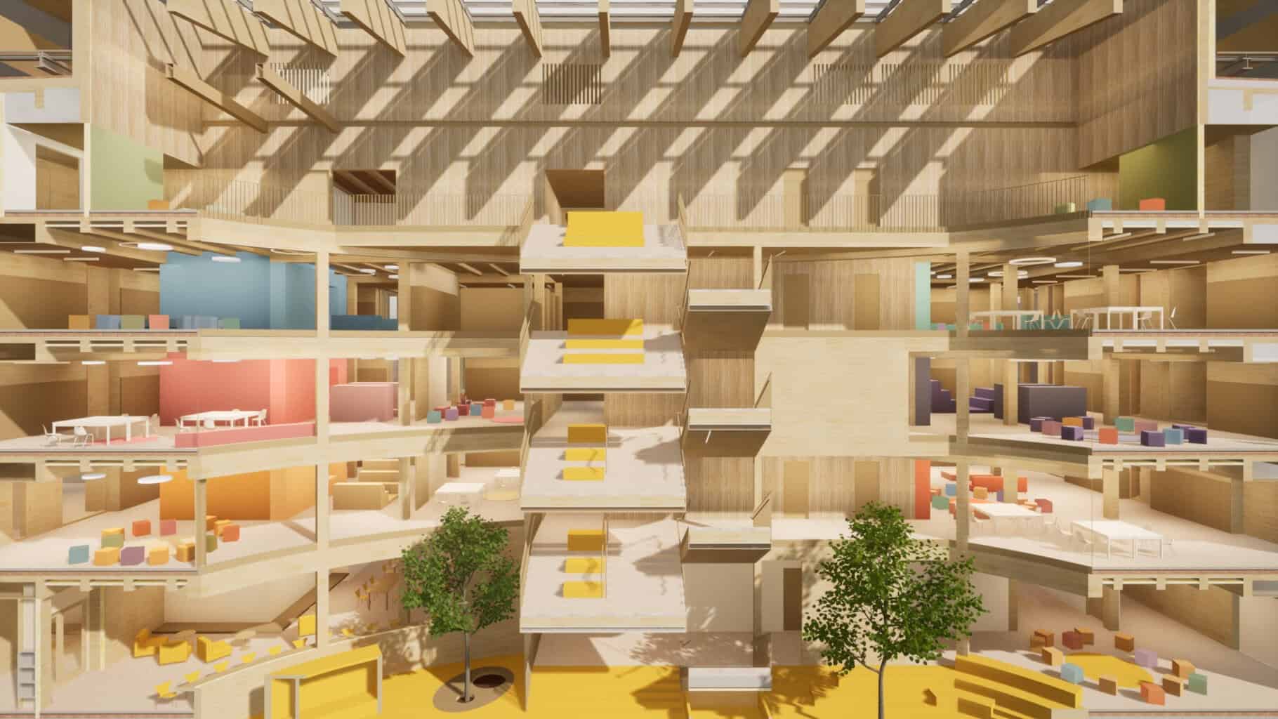 Die Tragkonstruktion besteht aus massiven Brettschichtholz-Stützen und Unterzügen. In hochbelasteten Bereichen kommt Buche-Furnierschichtholz zum Einsatz, ergänzt durch Holzmodule aus Leno-Brettsperrholz und Baubuchekomponenten. Die Fassade erhält eine Holzrahmenbaukonstruktion mit Holz-Lamellen-Schalung auf einer Fläche von rund 6.000 Quadratmetern. Züblin Timber produziert die Holzelemente im Werk in Aichach vor, was die Bauzeit spürbar verkürzt.