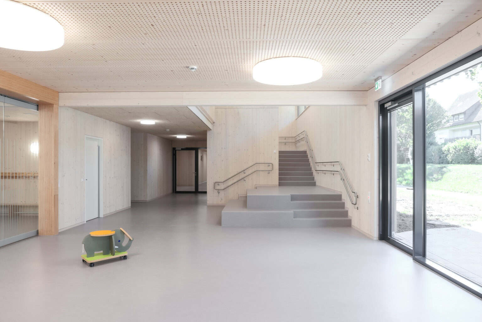 Sechs Gruppenräume reihen sich entlang der Längsachse. Jeder öffnet sich nach Westen über großzügige Glasflächen zur Landschaft und bietet freien Blick auf die Schwarzwaldhügel. Schlafräume, ein Musikzimmer, ein Werkraum, ein Inklusionsbereich sowie ein Mehrzweckraum am Eingang ergänzen das Raumprogramm. Vom Obergeschoss führt eine vorgelagerte Balkonzone direkt ins Freie. Ein Treppenhaus verbindet die Ebenen und fungiert zugleich als Begegnungsort und Spielraum.