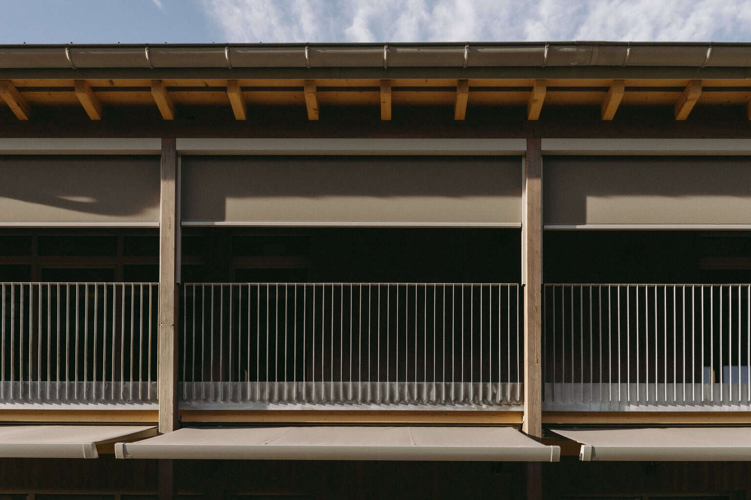 Die Westausrichtung der Gruppenräume erfordert eine kontrollierte Regulierung der Sonneneinstrahlung. Die großzügigen Dachvorsprünge übernehmen eine Doppelfunktion: Sie zitieren den konstruktiven Holzschutz traditioneller Scheunen und wirken als passiver Sonnenschutz. Zusammen mit den Markisen von MHZ bilden sie ein Gesamtsystem gegen Hitze, Strahlung und Blendung.