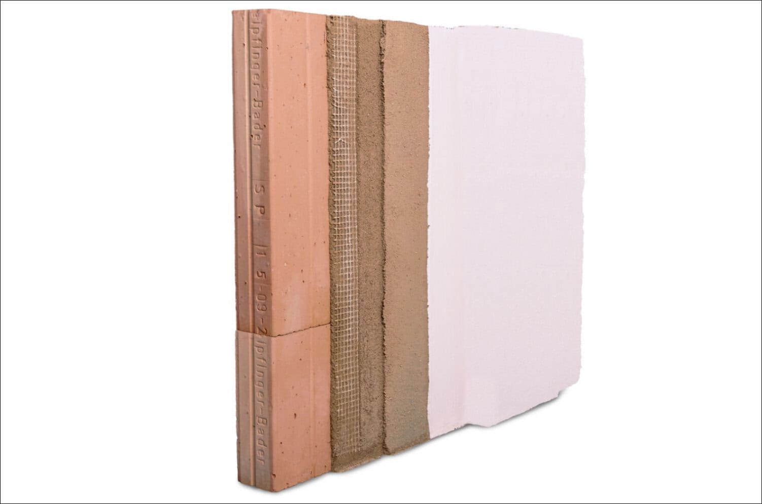 Die Außenwände bestehen aus Silvacor-Mauerziegeln, gefüllt mit 100 Prozent sortenreinen Nadelholzfasern. Bei diesem Untergrund muss die erste Putzschicht nicht komplett austrocknen, bevor die Verarbeiter die zweite Schicht auftragen können. Das Ziegelmauerwerk erreicht ohne zusätzliches Wärmedämm-Verbundsystem den KfW-40-Standard.