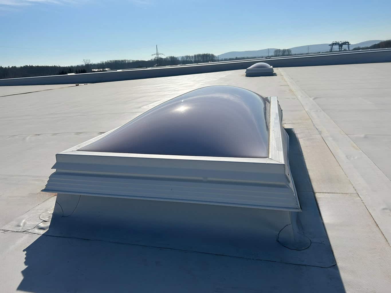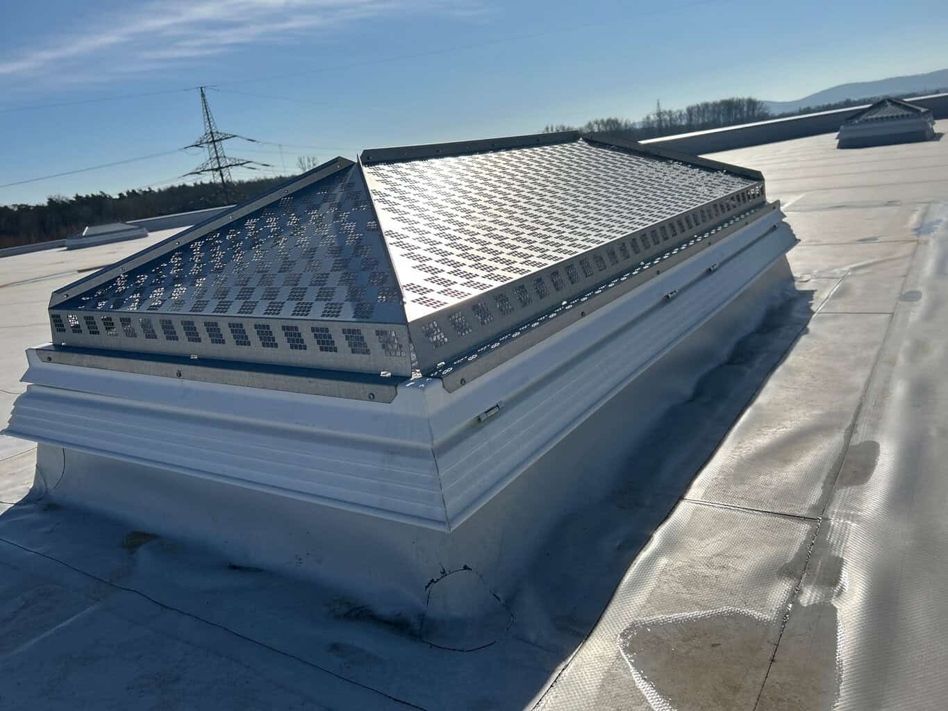Kingspan Light + Air lieferte ein abgestimmtes Komplettsystem: Lichtkuppeln des Typs Essmann LK classic 120/240 mit wärmegedämmten Metall-Aufsetzkranz sorgen für natürliche Belichtung und energetische Effizienz. Rauch- und Wärmeabzugsgeräte (NRWG F6 LK) gewährleisten im Ernstfall eine schnelle Entrauchung. Ab- und Durchsturzsicherungen (RSM) ergänzen die Lichtkuppeln ebenso wie das HDS-System zum Schutz gegen Hagel, Durchsturz und Sonneneinstrahlung. Notauslösestationen NAS-P vervollständigen die sicherheitstechnische Infrastruktur.