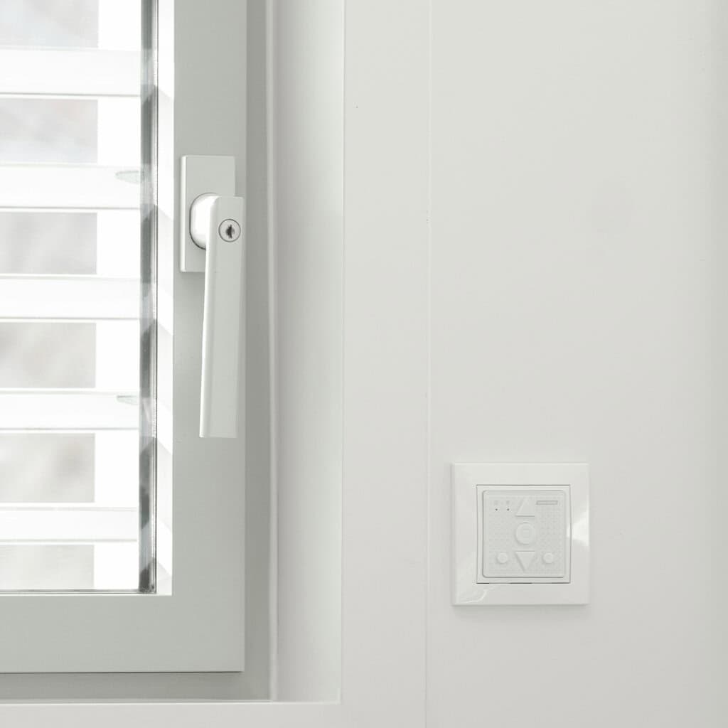 Die Bauherren installierten daher Raffstoren an 60 Fenstern. Die verdeckt in der Holzrahmenfassade montierten, schienengeführten Lamellen gewährleisten Hitze- und Blendschutz bei gleichzeitig optimaler Tageslichtausbeute. Ein Funksystem steuert die Raffstoren, um die Demontierbarkeit der Gebäudekonstruktion nicht durch aufwändige Verkabelungen zu behindern. Intelligente Sensoren erfassen Helligkeit und Wetterlage und ermöglichen eine automatische Steuerung der Raffstoren. Zusätzlich besteht die Möglichkeit, die Raffstoren manuell über Wandsender zu bedienen.