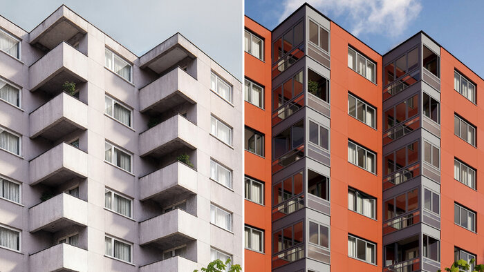 Das Modulsystem besteht aus einem Brüstungselement und einer Glas-Faltwand, die zu einer Einheit mit umlaufendem Profilrahmen verbunden sind. Die vorgefertigten Module werden auf der Baustelle montiert, was laut Hersteller die Montagezeiten verkürzt und Bewohner weniger beeinträchtigt.