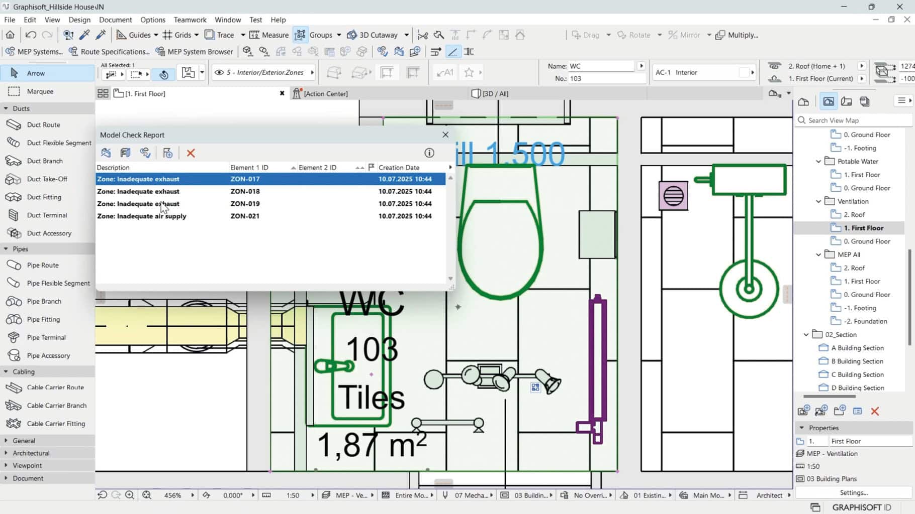 Die Software ermöglicht die Modellierung sowohl im Grundriss als auch in Schnitten und dreidimensionalen Darstellungen wie Perspektive und Axonometrie. Anwender arbeiten an einem Gesamtgebäudemodell, wodurch sich Rohrleitungen und Lüftungskanäle geschossübergreifend führen lassen. T-Stücke und Ventile fügen Planer mit einem Klick ein, Verbraucher schließt die Software automatisch an. Dabei bietet das Programm verschiedene Anschlussvarianten an. Eine Systemnavigation bildet das gesamte Leitungsnetz einschließlich aller Bauteile ab und zeigt auf Wunsch Systemparameter wie Nennweiten, Volumenstrom oder Geschwindigkeit tabellarisch an.