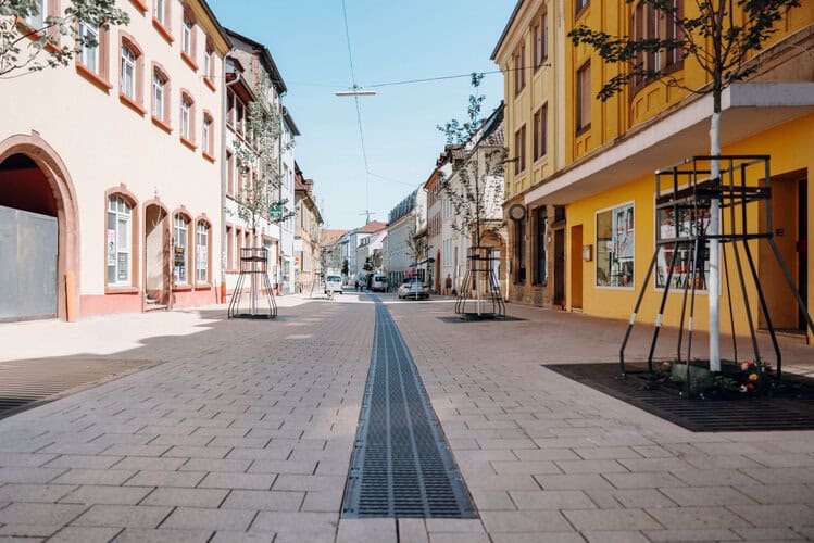 Das Wasser fließt nun über ein Filtersystem, das Schadstoffe wie Reifenabrieb, Mikroplastik und Schwermetalle zurückhält. Die Stadt speichert das gereinigte Regenwasser unterirdisch und nutzt es zur Bewässerung der neu gepflanzten Straßenbäume. Überschüssiges Wasser leitet sie mit maximal 15 Litern pro Sekunde in den Fluss Queich.