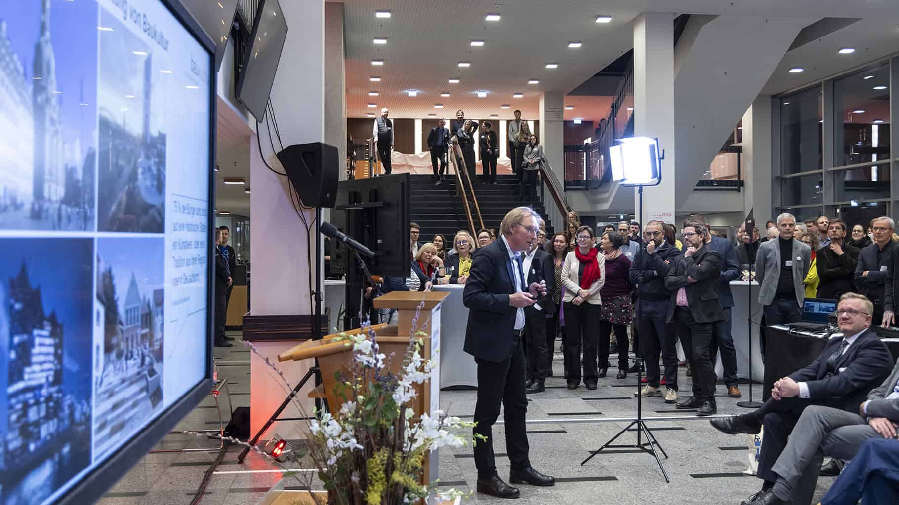 Daran knüpfte Reiner Nagel, Vorstandsvorsitzender der Bundesstiftung Baukultur, mit einem Impuls zum aktuellen Baukulturbericht „Infrastrukturen“ an. Er machte deutlich, dass funktionale Bauwerke zunehmend auch als Lebensräume und gestaltete Stadträume verstanden werden müssen – und damit stärker in den Fokus von Planung, Politik und Öffentlichkeit rücken.