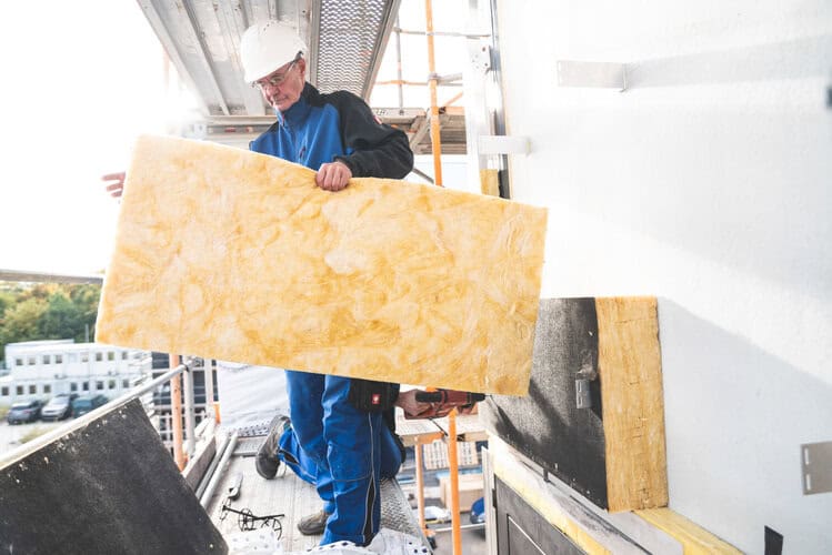 Die Fassadendämmplatten sind als nichtbrennbar klassifiziert und tragen das Umweltzeichen Blauer Engel. In den vier Neubauten wurden etwa 4.300 Quadratmeter dieser Platten installiert.