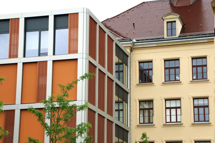 Bei der Sanierung und Erweiterung setzte man auf eine vorgehängte hinterlüftete Fassade (VHF) mit Fassadendämmplatten des Typs FDP 2/Vs von Ursa. Diese Konstruktion verbessert den Unternehmensangaben zufolge die Wärmedämmung und den Schallschutz des Gebäudes. Die Dämmplatten weisen einen Bemessungswert der Wärmeleitfähigkeit λB von 0,035 Watt pro Meter Kelvin auf.