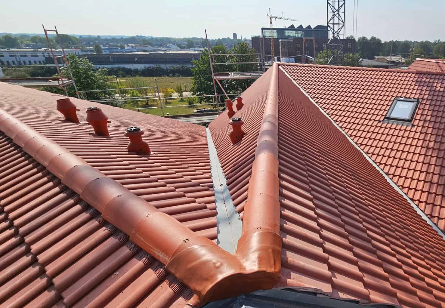 Die Wahl fiel auf den Aura-Lüfter DN 125 von Fleck. Der Lüfter verfügt über einen Standardkopf, eine abnehmbare Wetterkappe sowie einen Reduzierungsadapter auf DN 100. Die individuelle Einstellbarkeit ermöglicht einen stets lotrechten Einbau bis circa 60 Grad Dachneigung. Goldschmidtböing Bedachungen verbaute in den ersten beiden Bauabschnitten rund 300 Fleck Aura-Lüfter, insgesamt kommen circa 900 Lüfter zum Einsatz.