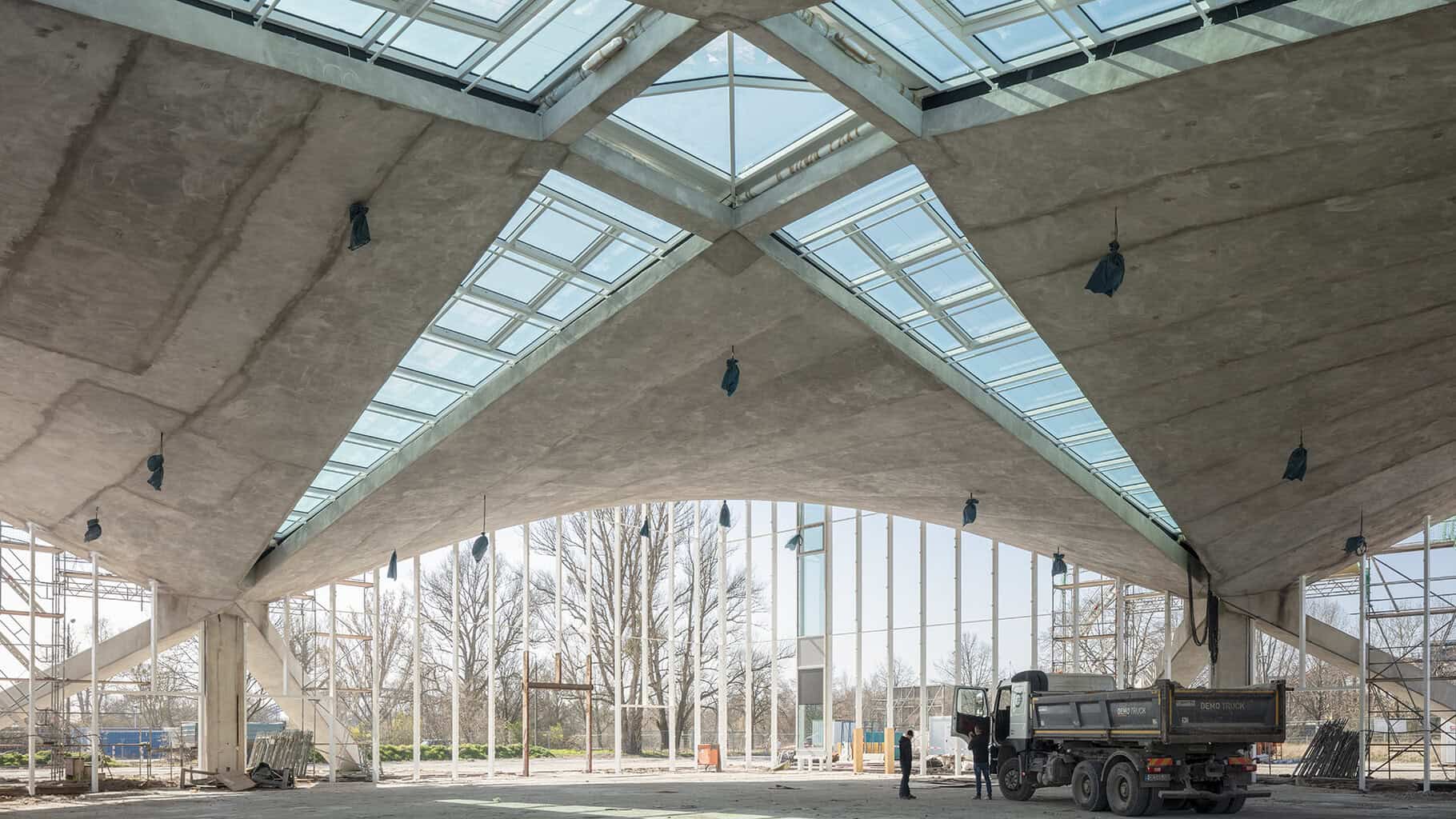 Zum Zeitpunkt der Instandsetzungsplanung lagen massive Schäden durch Feuchtigkeit und Frost sowie ein Tragfähigkeitsdefizit von rund 50 Prozent vor. Um das denkmalgeschützte Bauwerk zu erhalten und zugleich seine strukturelle Leistungsfähigkeit zu sichern, wurde eine lediglich 1 cm dünne Carbonbetonschicht als hochleistungsfähige Verstärkung aufgebracht. Besonders hervorzuheben ist, dass in diesem Projekt die speziellen Materialeigenschaften von Carbonbeton gezielt ausgenutzt wurden und diese die Aufgabenstellung in überzeugender Weise erfüllen. So konnte die sensible Schalenstruktur materialeffizient und dauerhaft ertüchtigt werden, bei vollständigem Erhalt der ursprünglichen Formsprache.