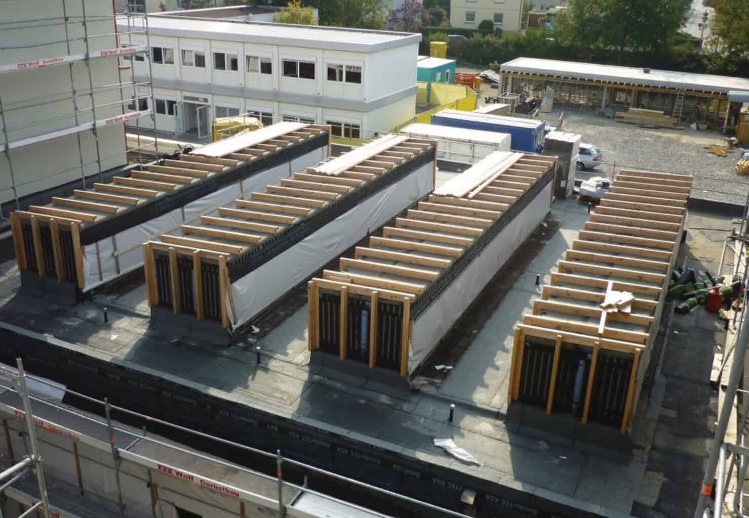 Die Holzkonstruktion bildet die Basis des Dachaufbaus. Sie besteht aus Brettschicht-, Massiv- oder Brettsperrholz, übernimmt die tragende Funktion und muss dauerhaft vor Feuchtigkeit geschützt werden. Auf der Holztragkonstruktion bringen die Handwerker eine Trennlage auf. Diese fungiert als Behelfsabdichtung und ermöglicht Bewegungen der Holzkonstruktion aufgrund von Feuchteschwankungen. Die Trennlage aus Bitumenbahnen wird verdeckt befestigt, die Nähte werden abgedichtet.