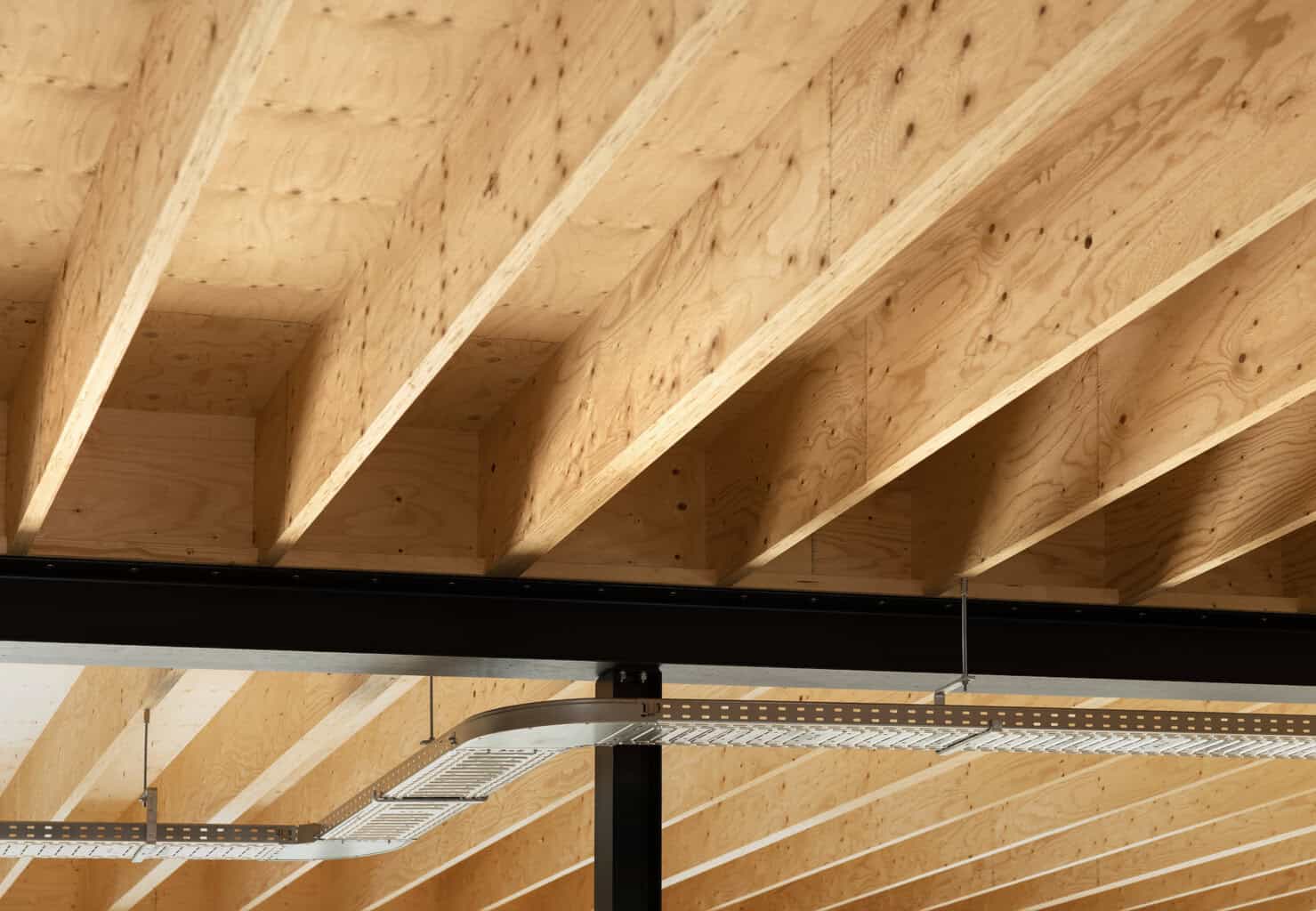 Das Verhältnis von Festigkeit zu Gewicht erlaubt besonders schlanke Querschnitte bei großen Spannweiten. Eine Kerto-Ripa-Deckenkonstruktion kommt auf rund 34 Kilogramm pro Quadratmeter – eine Stahlbetondecke vergleichbarer Funktion bringt etwa 675 Kilogramm auf die Waage. Das entspricht einer Einsparung von über 90 Prozent.