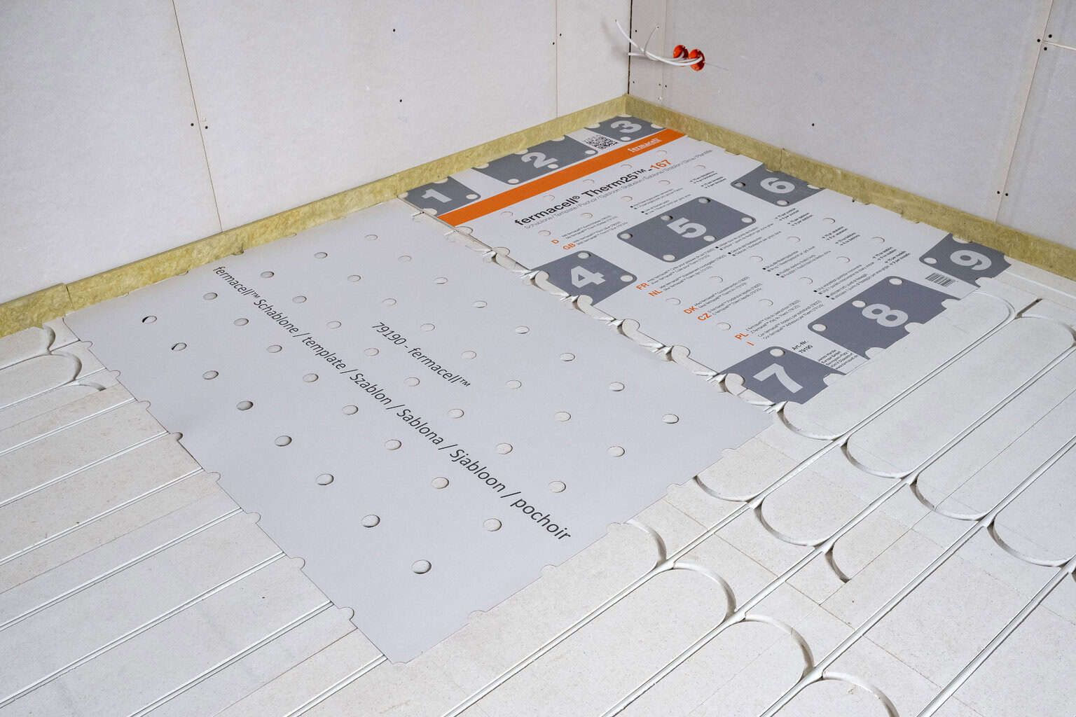 Eine neu gestaltete Schablone zeigt bei der Montage exakt an, wo die neun Fixierungen anzubringen sind, ohne die Heizrohre zu beschädigen. Das System arbeite zu 100 Prozent trocken und kombiniere eine geringe Aufbauhöhe mit der geforderten Heizleistung, heißt es. Die Konstruktion erfüllt dem Hersteller zufolge die Anforderungen an Schall- und Brandschutz und eignet sich für zertifizierte Bauprojekte mit ökologischer Ausrichtung. (mb)