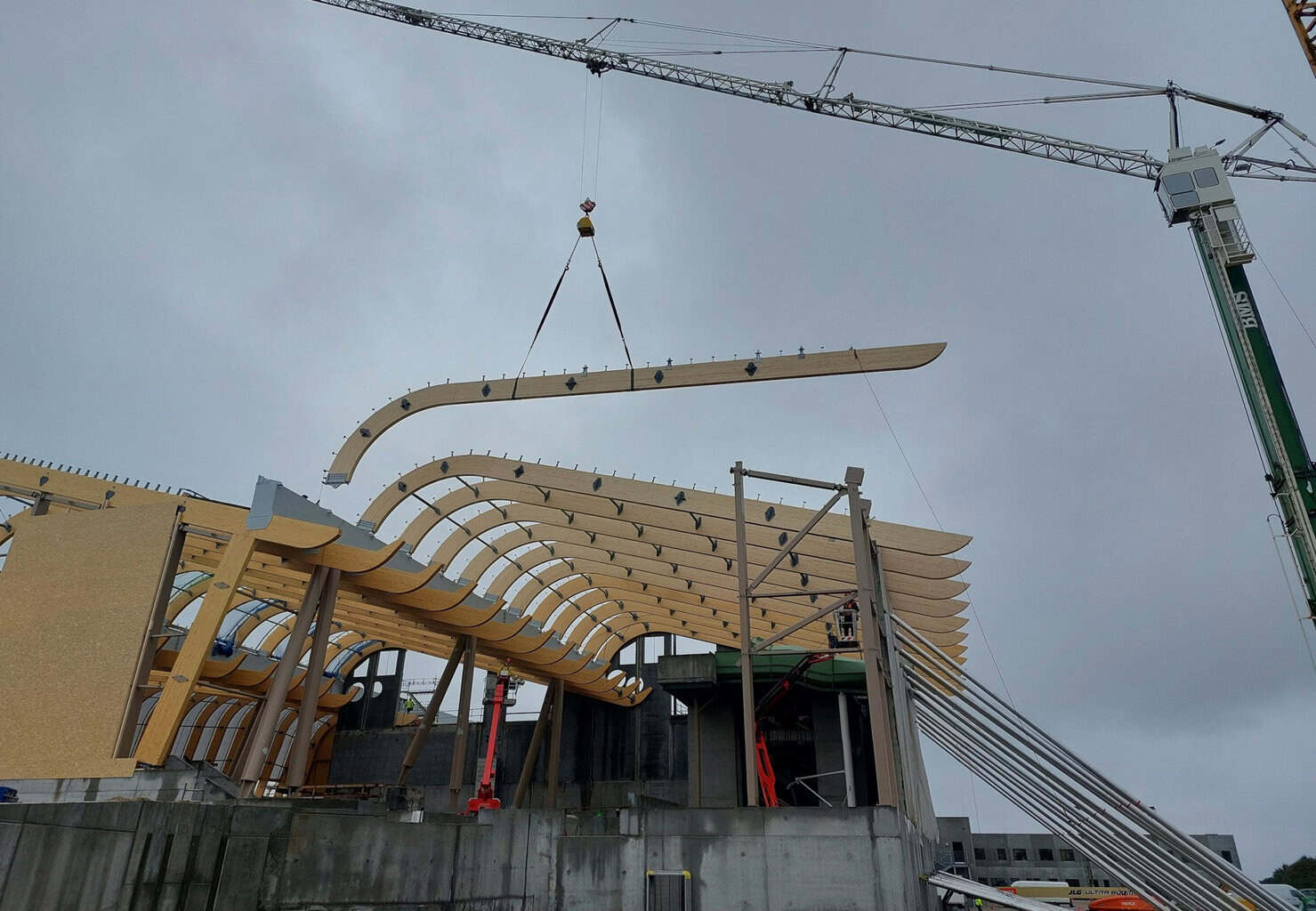 Plansite erstellte zunächst Konstruktionspläne der Brettschichtholzteile im 3D-Gebäudemodell, die als Basis für Montage- und Werkpläne dienten. Das Unternehmen entwickelte zudem Werkstattzeichnungen und Maschinendaten für Stahl- und Holzbau.