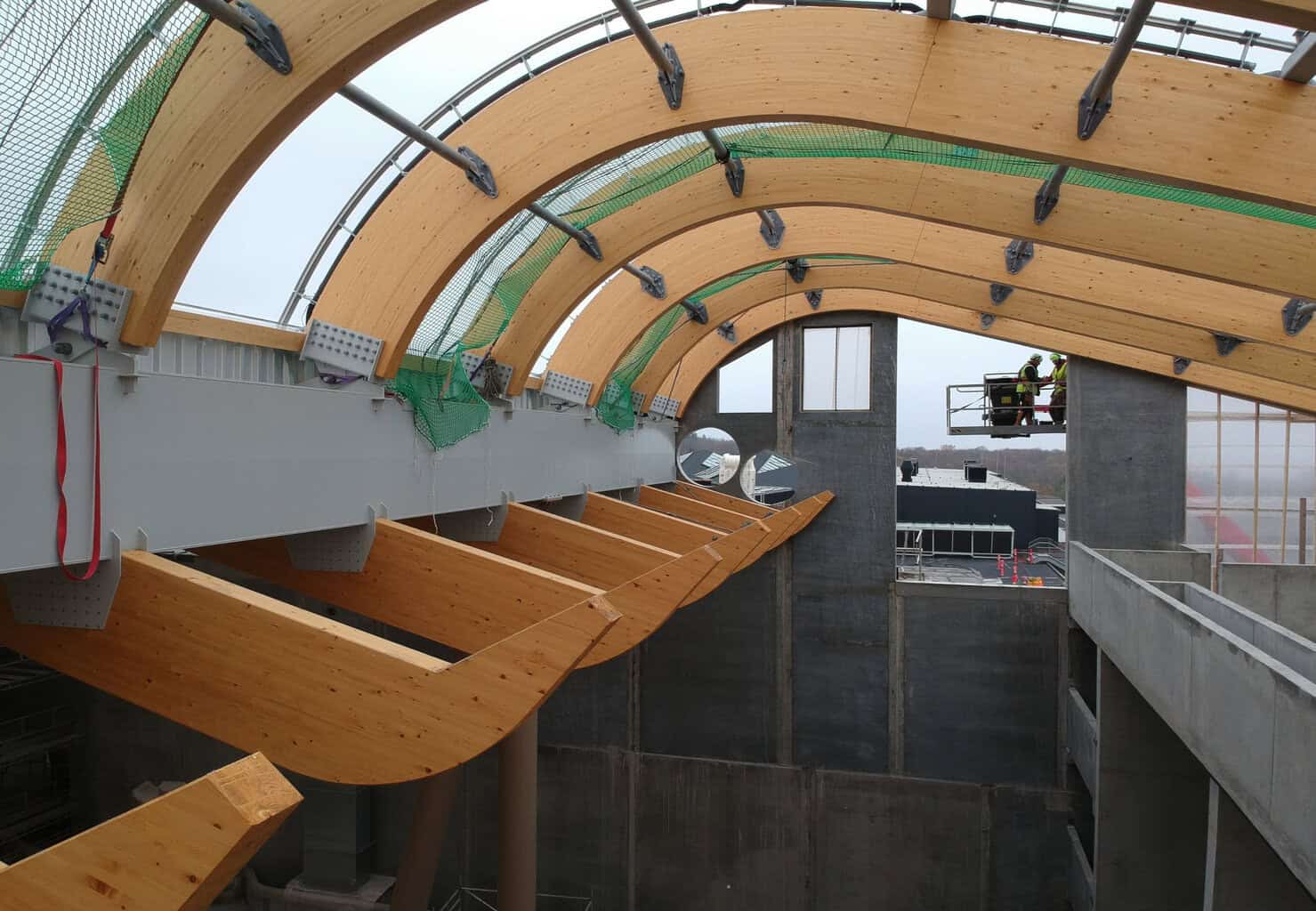 Die geschwungene Formgebung erforderte präzise Planung: Jede Anschlussplatte der Druckstäbe weist unterschiedliche Winkel auf. Building Information Modeling (BIM) und ein digitales Gebäudemodell ermöglichten die millimetergenaue Abstimmung sämtlicher Bauteile. Das 3D-Modell diente der Werk- und Montageplanung sowie der Kollisionsprüfung zwischen den Gewerken.
