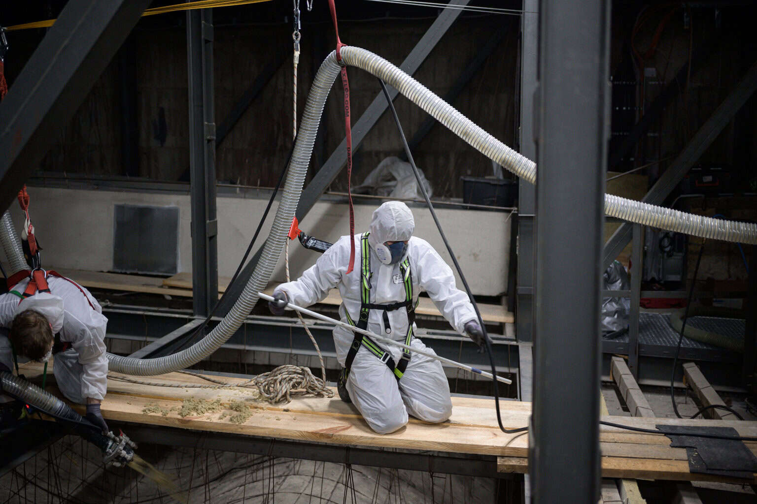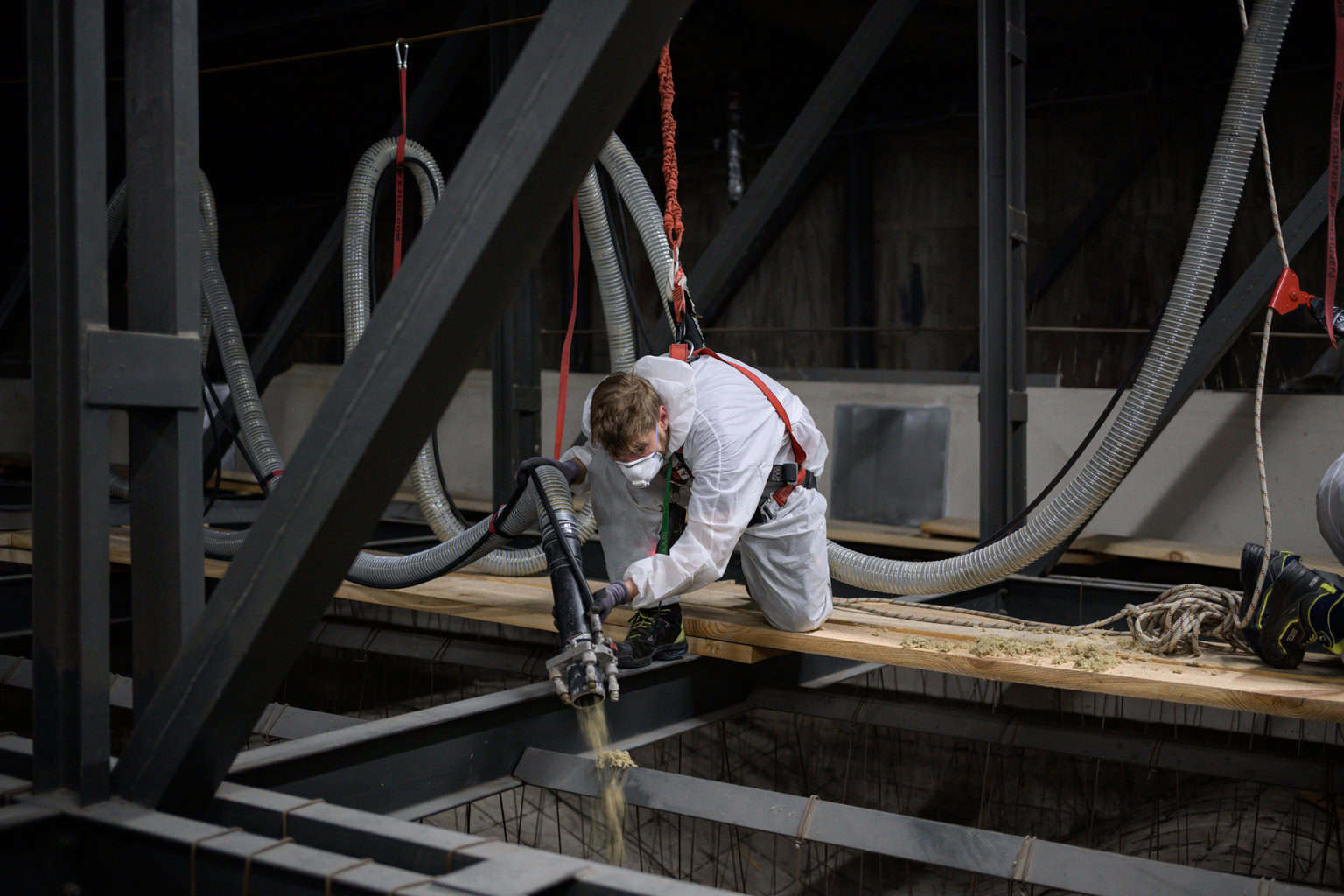 Im Zuge der Schadstoffbeseitigung und zur Verbesserung des Brandschutzes bauten Fachleute die alte Karmelitdämmung aus den 1960er Jahren aus. Für die Erneuerung der Dämmung über der gesamten Decke verlegten Mitarbeiter zusätzliche Laufwege aus Holzplanken. Die Tragkonstruktion aus Stahl befindet sich in sehr gutem Zustand. Auf den Laufwegen bewegten sich die Experten sicher und führten Schläuche mit sich, über die sie das Steinwolle-Granulat auf die Decke aufblasen.