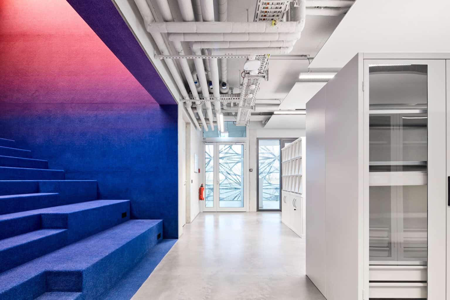 Die Sitzkojen zwischen den Ebenen bieten Raum für den Austausch zwischen Seminaren und Vorlesungen. Die Farbverläufe in den textilen Oberflächen referenzieren die Gobelin-Tradition – jene Bildgewirke, die in der französischen Innenarchitektur des 17. und 18. Jahrhunderts zum Einsatz kamen.