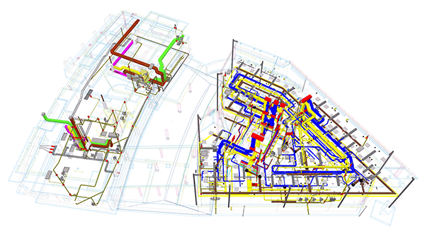 Die Koordination mit der Haustechnik wurde durch das 3D-Modell deutlich vereinfacht. Die Partner setzten hier ebenfalls auf einen Open-BIM-Prozess und den Austausch über das offene IFC-Format. Anhand der 3D-Darstellung war sofort erkennbar, auf welcher Höhe Aussparungen z. B. durch Unterzüge laufen. Das umständliche Berechnen der Aussparungslage im Verhältnis zur Unterkante des Unterzugs entfällt, da die Maße direkt aus dem Modell abgegriffen werden können. Beim Verlegen von Leitungen war sofort ersichtlich, welche Auswirkungen dies auf die anderen Gewerke hat.